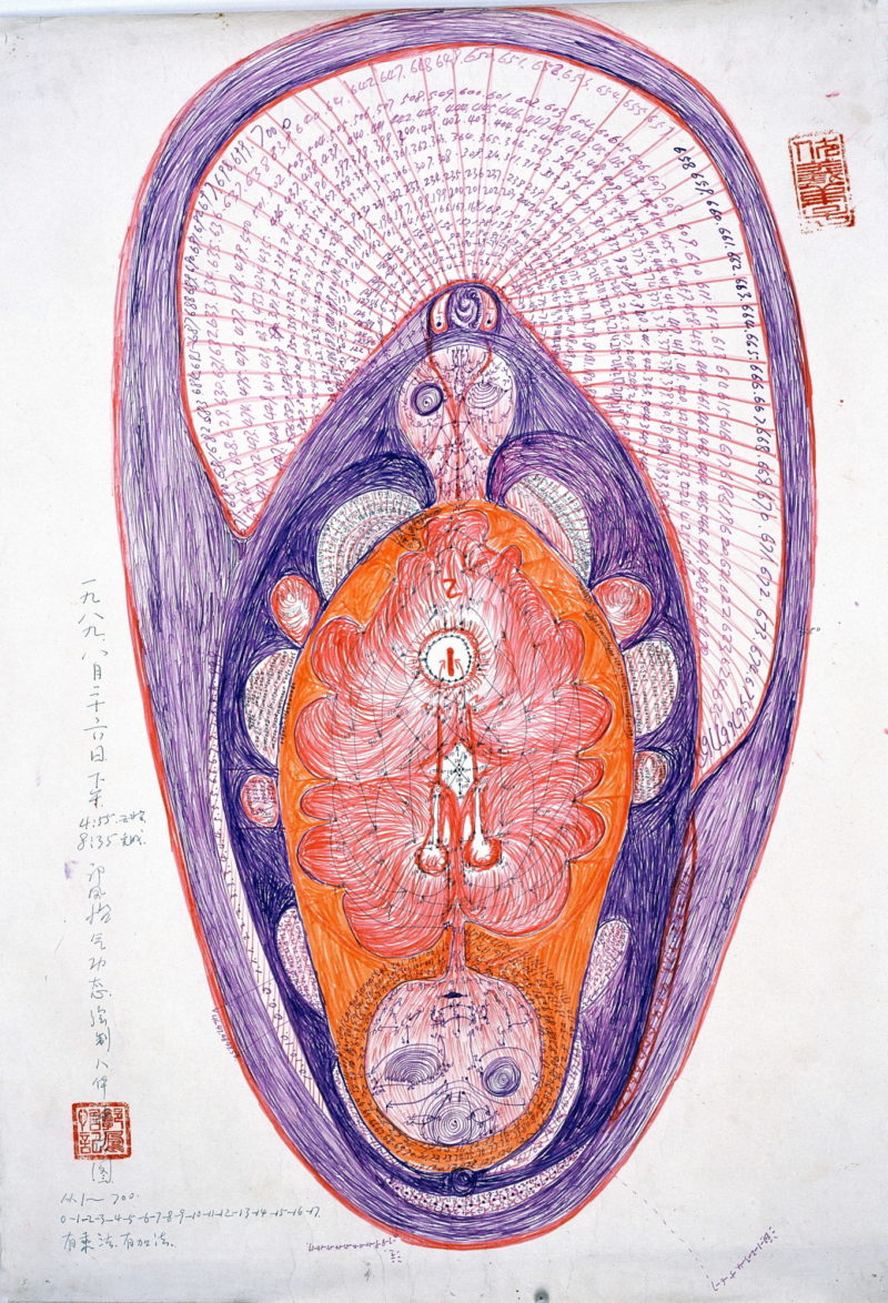 Born in 1942 in Xi’an, Guo began making art in her late forties after debilitating arthritis forced her into early retirement from a job at a chemical fertilizer factory. To alleviate her chronic pain, Guo devoted herself to qigong—an ancient Chinese wellness and healing technique that combines coordinated movements, breathing, and meditation. Qigong allowed Guo, who did not have an academic art training, to develop a deeply personal and symbolically charged visual language. During her meditations, Guo drew what she envisioned, creating intricate ink drawings on subjects ranging from cosmology and Chinese mythology to traditional Chinese medicine and philosophy.