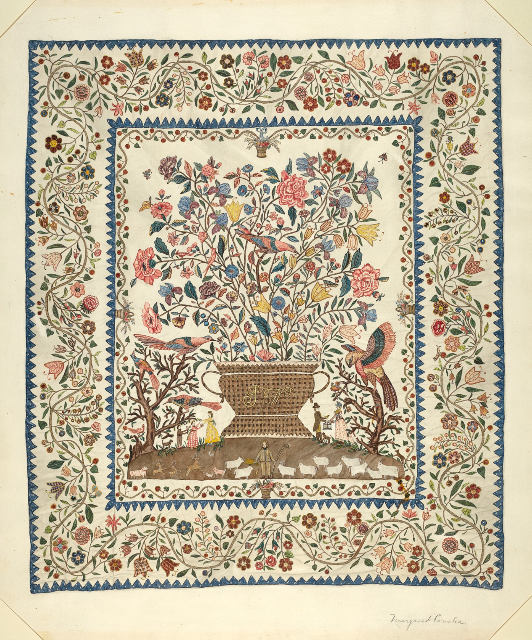 Margaret Concha, Applique and Embroidered Coverlet, 1935/1942. Watercolor, graphite, and pen and ink on paper, 23 7/16 x 19 13/16 inches (59.5 x 50.4 cm). National Gallery of Art, Washington, Index of American Design, 1943.