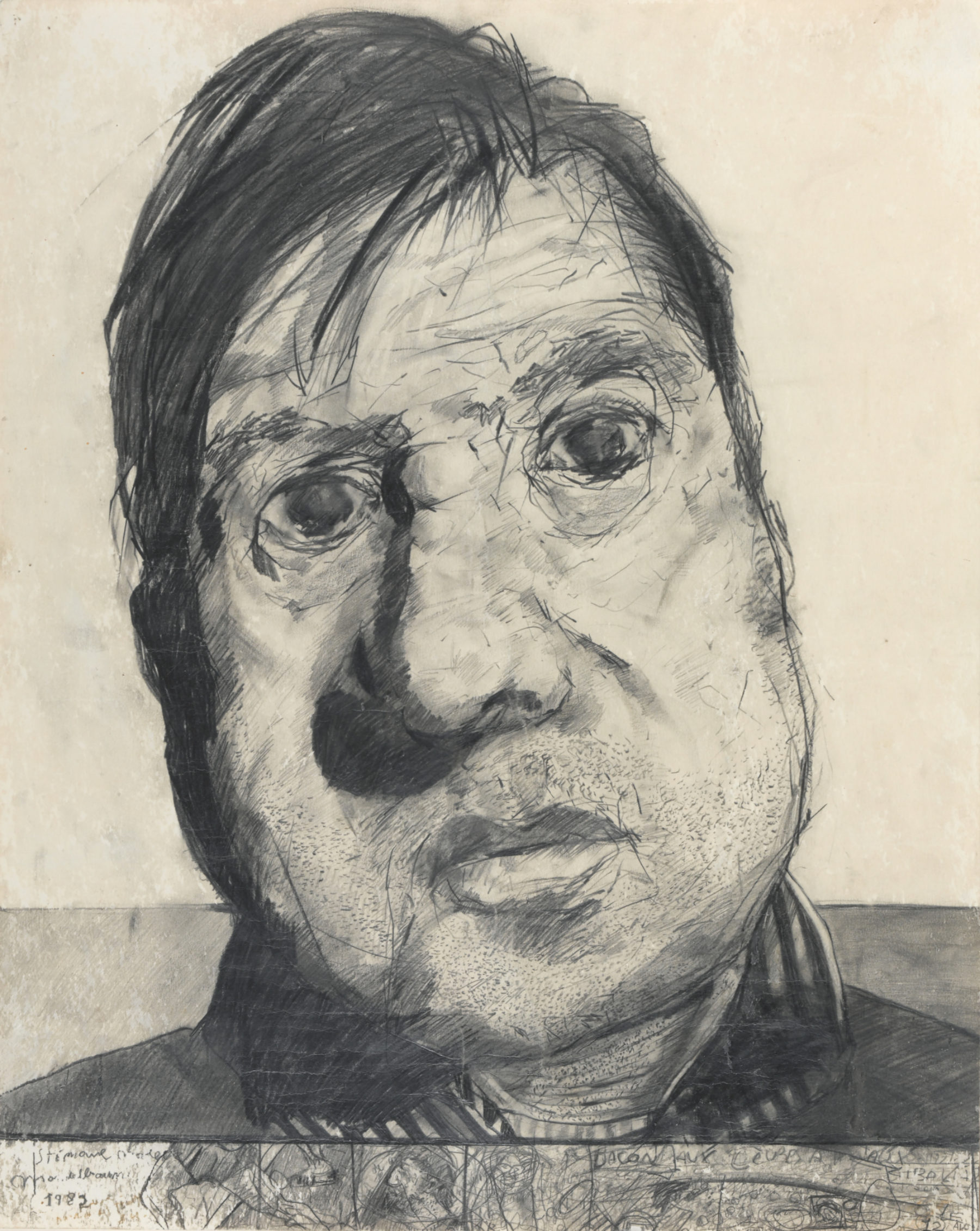Stéphane Mandelbaum, Bacon et prédelle avec portrait d'Arié (Bacon and predella with portrait of Arié), 1982. Graphite on paper, 23 1/2 x 19 inches (59.6 x 48.3 cm). Collection of Paula Hauser, Brussels. Photo: Philippe Migeat © Stéphane Mandelbaum Estate