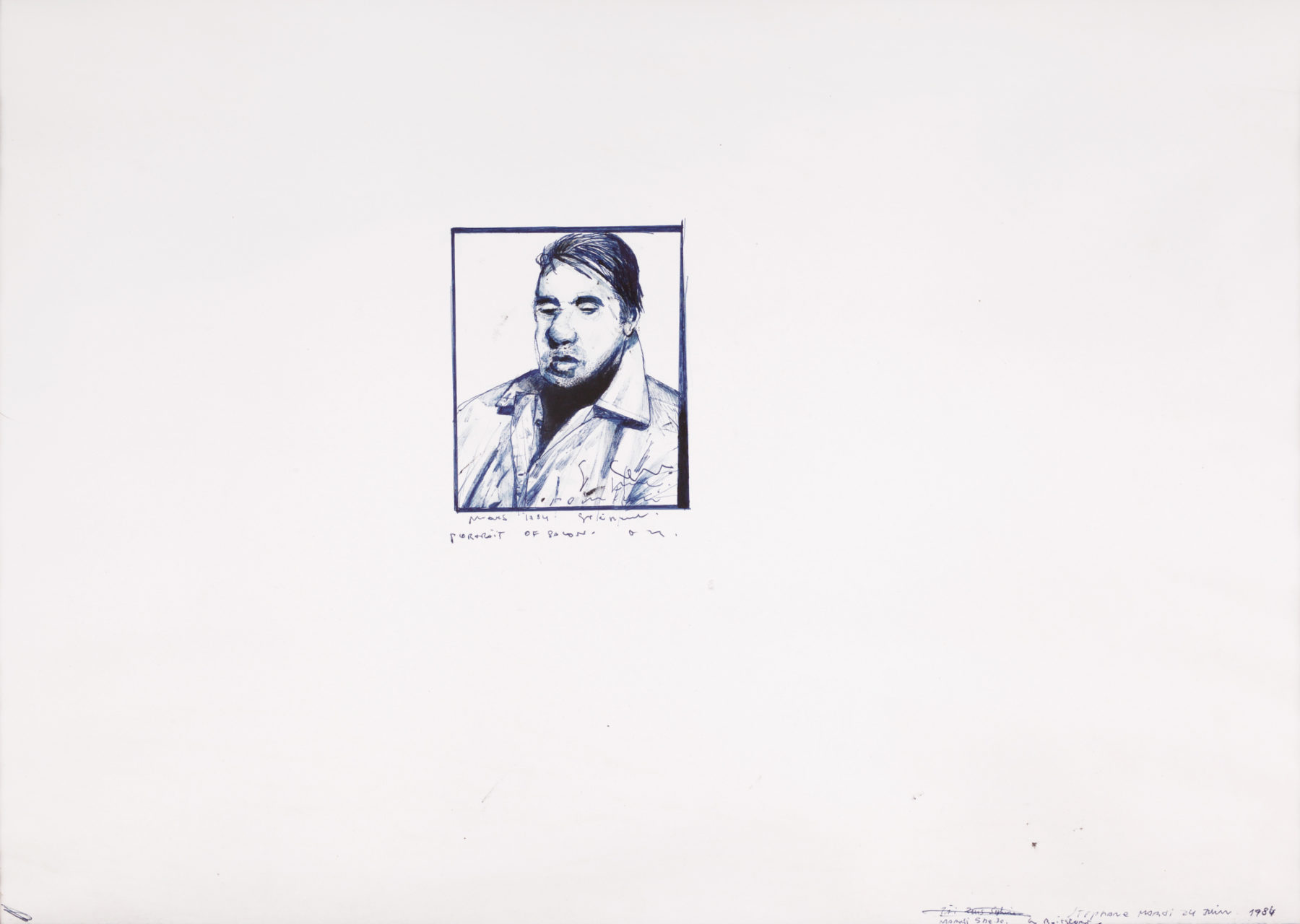 Stéphane Mandelbaum, Portrait of Bacon, 1980. Ballpoint pen on paper, 18 1/2 x 27 1/8 inches (47 x 69 cm). Museum für Moderne Kunst, Frankfurt am Main. Photo: Bertrand Michau © Stéphane Mandelbaum Estate