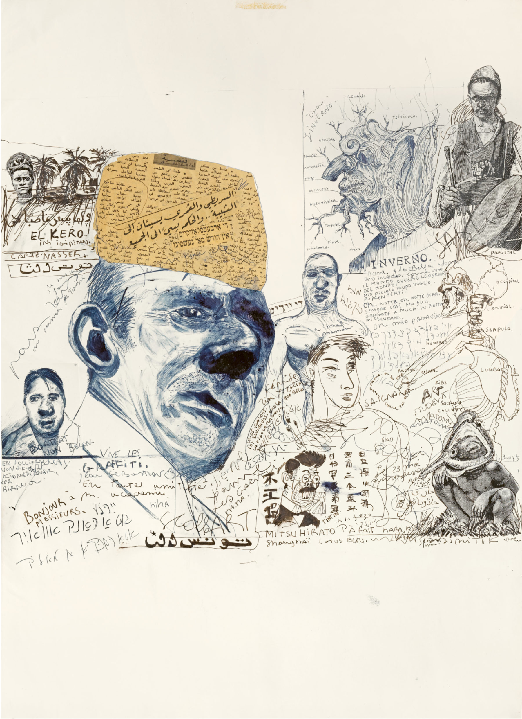 Stéphane Mandelbaum, Composition (El Kero), 1981. Ballpoint pen, marker, and collage on paper, 27 1/2 x 19 11/16 inches (69.8 × 50 cm). Antoine de Galbert Collection, Paris. Photo: Philippe Migeat © Stéphane Mandelbaum Estate