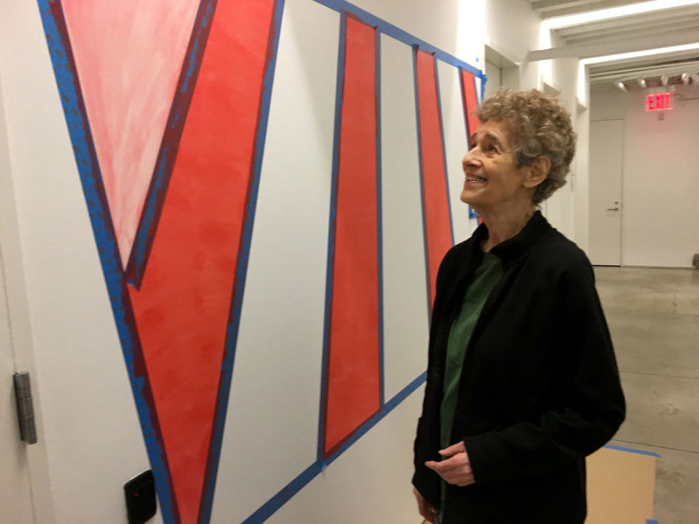 Photo: Jackie Ferrara prepping her installation in The Drawing Center’s Lab corridor, 2016.